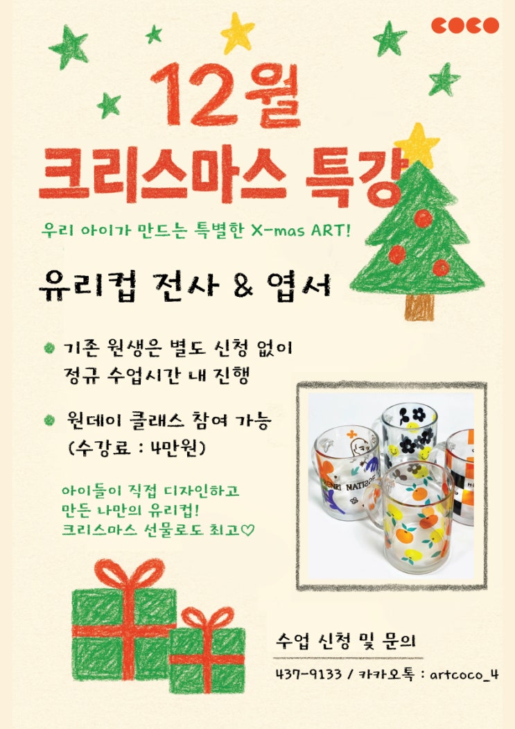 안녕하세요! 코코쌤이 즐거운 포스팅을 들고 컴백했습니다. 벌써 2025년의 마지막 달인 12월이 시작되었답니다... 한해가 왜이리도 빨리 가는 지 .... 우리 코코친구들도 연말 공연 및 졸업식으로 바쁜 하루 하루를 보내고 있는 것 같아요. 무엇보다 졸업식들이 얼마 남지 않아 코코쌤 코끝이 찡- 하답니다. (언제 이리 커버린겨~?!) 연말에 크리스마스도 있는데 12월을 이렇게 그냥 보낼 수는 없다!!!! 저희 아트코코미술학원에서 [12월 크리스마스 특강]을 준비했습니다. 기존 다니고 있는 우리 코코친구들뿐만 아니라 다른 친구들도 원데이클래스로 참여가 가능한 수업이라 우리 친구들 많이 기대하고 있어요~ 12월 크리스마스 특강은 우....... <img src="https://blogthumb.pstatic.net/MjAyNTEyMDFfMjU3/MDAxNzY0NTg2Nzk5Nzkw.DkEQWPVq2A-VFeqJjPc_ErLEf8sSpVqXoKR_rCJ3EMQg.FxMzdZlwTIy-j93o1yFhGaZJ5BvlkEON9xK14ELyukMg.JPEG/%BE%C6%C6%AE%C4%DA%C4%DA%B9%CC%BC%FA%C7%D0%BF%F8_12%BF%F9%C6%AF%B0%AD.jpg?type=s3" />