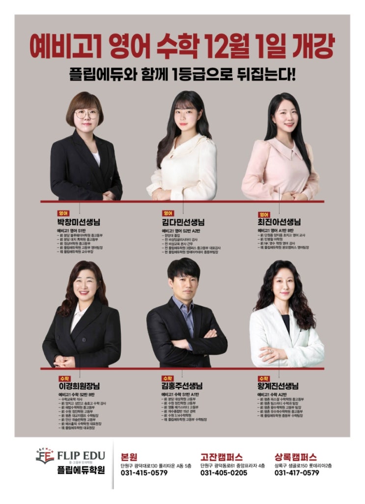 예비고1 영어 수학 12월 1일 개강입니다. 상록캠퍼스 영어 수학은 정원 초가로 11월말 조기 마감되었습니다. 감사합니다. <예비고1 시간표 상록캠퍼스> 영어 : 월수 4시/6시/8시 수학 : 화목 5시/7시/7시30분 <예비고1 시간표 고잔캠퍼스> 영어 : 월수 5시/7시 수학 : 화목 5시30분/7시30분 문의사항은 상록캠 010-4270-9744 고잔캠 010-9795-9535로 연락주세요 #플립에듀학원 <img src="https://blogthumb.pstatic.net/MjAyNTEyMDNfMTI1/MDAxNzY0NzI1MjAxNjE3.XqpI18UdKG3ZCnpNc6P7j7DcSzM0KfloigusNg_ZMycg.QsJWhcri6YDCXqT8VwOD7V8VUfHe1YxHluOYUBnfRWsg.JPEG/900%A3%DF1761695073284.jpg?type=s3" />
