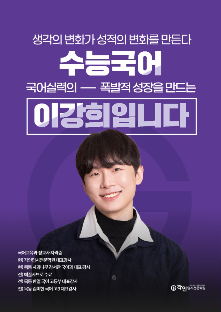 안녕하세요. 이강희 국어입니다. 압도적 수강생 증가율로 증명한 국어실력의 폭발적 성장 감이 아닌 근거 중심 독해로, 누가 풀어도 같은 답에 도달하는 국어 공부법. 수능 1교시를 찬란한 시간으로 만들어드립니다. 주요이력 22년~25년 국어 수강생 증가율 1100% 前) 사과나무학원 국어 수강생 전체 1위 現) 각인 입시 전문학원 現) 목동 사과나무 학원 前) 목동 김미현국어학원 고3 대표강사 前) 스카이에듀(인강)강사 서바이벌 수료 한 해의 흐름으로 완성되는 학습의 여정 "의심" : [12월~2월] 평가원을 파악하고 이해하는 시간 "서광" : [3월~6월] 내신 대비와 수능 집중반의 이원화 "정진" : [6월....... <img src="https://blogthumb.pstatic.net/MjAyNTEyMDhfNDEg/MDAxNzY1MTcyNTc3OTk4.zGSWAeypH3EGRbBrNXOJrsKiOCnnnz5IC5ZTbz2rCoIg.0UHeYZBzhf-J2SA5QGEssZvoTU0KnW2Wch-xpWUWADog.JPEG/%B0%AD%BB%E7%C8%AB%BA%B8%BF%EB.jpg?type=s3" />