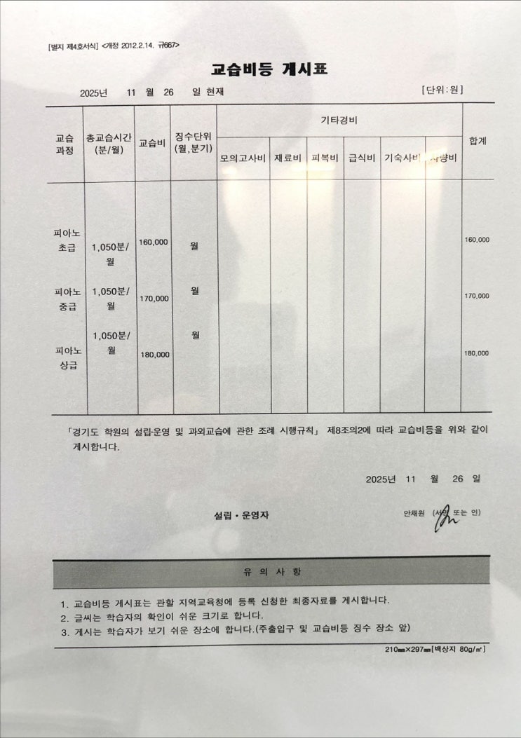 [향동피아노/라벨피아노] 수강료 안내