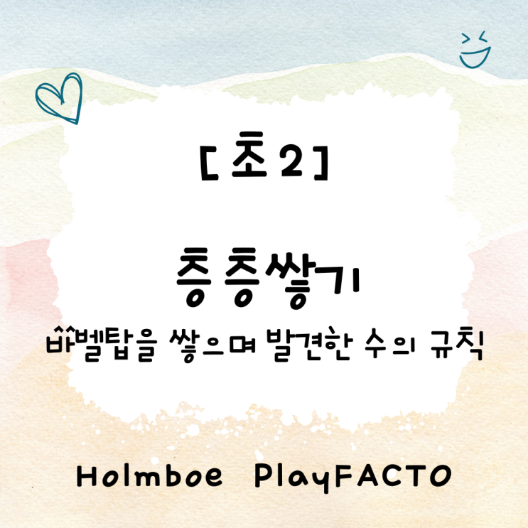 초2 - 바벨탑을 쌓으며 발견한 수의 규칙 《층층쌓기》 안녕하세요! 놀면서 배우는 수학, 구리시 인창동 홀름보에 플레이팩토입니다! 이번 시간에는 바벨탑 이야기를 읽어보며 수업을 시작했습니다. 이야기를 읽은 뒤, 쌓기나무를 이용해 바벨탑을 직접 6층까지 쌓아보는 활동을 진행했습니다. 탑을 하나씩 쌓아보면서 아이들은 자연스럽게 층마다 필요한 쌓기나무의 개수에 규칙이 있다는 것을 발견했습니다. 1층 : 2개 2층 : 3개 3층 : 4개 4층 : 5개 이처럼 층이 올라갈수록 필요한 쌓기나무가 일정한 규칙으로 늘어난다는 것을 찾았습니다. 규칙을 발견하고 나니 실제로 쌓지 않아도 필요한 개수를 예측할 수 있게 됩니다. 이후에는 높이 쌓....... <img src="https://blogthumb.pstatic.net/MjAyNjAzMDlfMTMz/MDAxNzczMDM2NDgxNjA4.LwV_soc3z5f_SSnxoC_YFOS8l1NkQA0BxHCdrL8EXhwg.gK4st4FYHa1j2HyDdmjS5OPUw8as5K4EF73IuEcV1Asg.PNG/%BD%E6%B3%D7%C0%CF_%BC%F6%BE%F7%281%B0%FC%29.png?type=s3" />
