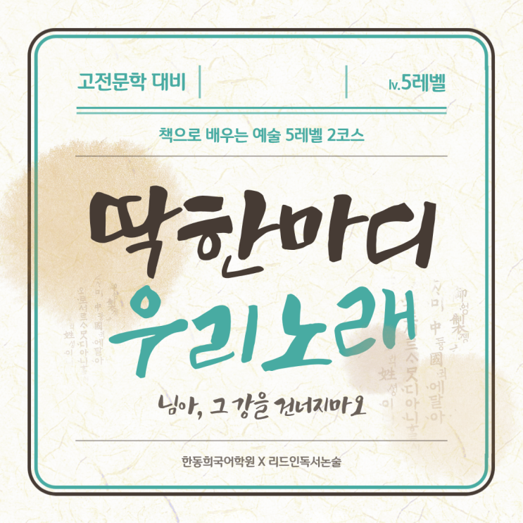 안녕하세요 독서와 국어로 성장하는 한동희 리드인 국어학원 입니다 리드인 5레벨 도서 <딱한마디 우리노래>입니다. 고등학교에 진학하면 고전문학이라는 어려운 장르가 등장하는데요.. 저는 이 책이 무조건! 도움이 될 거라고 확신합니다. 그래서 5레벨인 중학생 친구들에게는 무조건 한 번씩 읽히고 넘어가곤 하는데요. ㅎㅎ 고전문학 중에서도 정말 유명하고 대중적인 작품들을 아주 쉽고 재미있게 풀어서 설명해주는 책이에요. 고조선부터 조선까지 조상들의 노래 엿듣기 [줄거리] 남편의 죽음을 안타까워한 아내의 노래 〈공무도하가〉, 아내와 이별한 유리왕의 외로움이 나타난 〈황조가>, 가야 수로왕 탄생 이야기를 담은 〈....... <img src="https://blogthumb.pstatic.net/MjAyNTEyMjdfMjQ0/MDAxNzY2ODQ0MTU2ODA1.e69QSn6br_pDPBNp-RbyNd3lbvpUqNpKyrMZybu5IY4g.ugXCuWW1fYazdGmYplO8XRp00bgBf2qSC1c_8UMlMEog.PNG/%B8%AE%B5%E5%C0%CE.png?type=s3" />