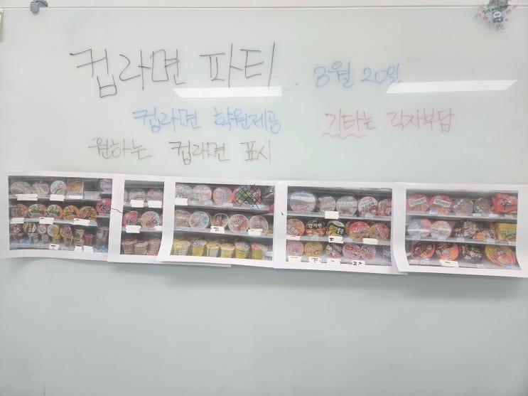 컵라면 파티 아이들이 먹고 싶어 하는 컵라면을 직접 편의점에서 골라 와서 즐거운 컵라면 파티를 준비했습니다. 처음엔 원하는 종류를 쓰게했다가 그냥 편의점에 가서 컵라면 사진을 통째로 찍어왔어요~ 초6 우**학생은 매일 먹고싶은 컵라면 종류가 달라진다고 진심 깊이 고민하더라고요~~ 귀여워.^^ 그런데 아니, 불닭이 이렇게나 많을 줄이야! 아이들이 가장 선호하는 컵라면이 까르보불닭이라니요. 무려 12명의 아이들이 선택했다는게... 그 매운 라면을 '헥헥'거리면서도 맛있게 먹어치우는 모습을 보며 정말 대단하다는 생각이 들었습니다. 특히 중1 권** 학생은 가장 맵다는 오리지널 불닭을 단숨에 먹어치웠어요. 그러고는 “....... <img src="https://blogthumb.pstatic.net/MjAyNjAzMjVfMjAz/MDAxNzc0NDAyMDUzMjAy.hce2S6l2jQB2lgt4LiC486aZII6ps1vkUrQCRD0YYBMg.54lmf3hdd7135U5kC0AeO-5jhnSPq_hQ98oDgBc7bOEg.JPEG/20260319_142850.jpg?type=s3" />