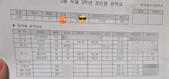 올해부터는 고등부에 확실히 자리잡기 위한 준비로, 우리가 그동안 키워왔던 학생들의 성과를 많이 홍보할 예정. 최종적으로는 대입까지. 3월 모의고사에서 고3에서 100점 나옴. 서해고 학생은 88점이 나왔는데도, 예상 퍼센티지가 99% 인걸 보면, 100점이면 전국에서 등수로 세어야 할것같다. (저 성적표의 퍼센티지는 동산고 내에서의 퍼센티지이므로, 174명중 1등이란 뜻) 사실 우린 수능최저를 위한 발걸음이니, 1등급이면 되긴 하는데, 수학이 여유있으면 좋은 일..^^ 한편 고1 3모의 경우는 완전히 중등파트로 나오기 때문에, 사실상의 도형테스트가 된다. 그래서 현재 영재학교 대비중인 중2학생들 시험봤는데, 제일 잘 본 학생이 사실상....... <img src="https://blogthumb.pstatic.net/MjAyNjAzMjdfMjYx/MDAxNzc0NjIyNTU3MDcx.xAMAhP17bWjBDFpHKhBYI8aTgapF-CG0PNFqLGXTqK0g.bn1k6ci2pn2-Aolt00_QKVd4ytQ3jruyQVR14kDJQVwg.JPEG/%B0%ED3_3%B8%F0_%B1%E8%C1%F8%BC%AD_%B5%B9%B8%B0%B0%C5.jpg?type=s3" />
