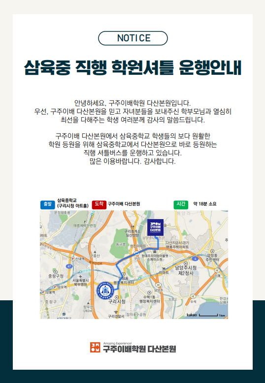 안녕하세요, 다산구주이배 학원입니다. 26학년도 셔틀 차량 운행 안내합니다. < 다산 구주이배 학원 셔틀 운행 지역> 다산 신도시 지역 갈매, 퇴계원, 별내 평내호평을 운행합니다. ◆ 구주이배 다산본원 차량운행표◆ <img src="https://blogthumb.pstatic.net/MjAyNjAyMTBfMTEx/MDAxNzcwNzE5MTA5NjY1.u-NsFrUEG1lfyadF1u6rUA6B9TgGFTnap48G-fX2Kk0g.Bh8MfcGliHHcKgtxH4KUsyKuwo3F9fwJ0vqHKE7LLK0g.PNG/%BB%EF%C0%B0%C1%DF%BC%C5%C6%B2.png?type=s3" />