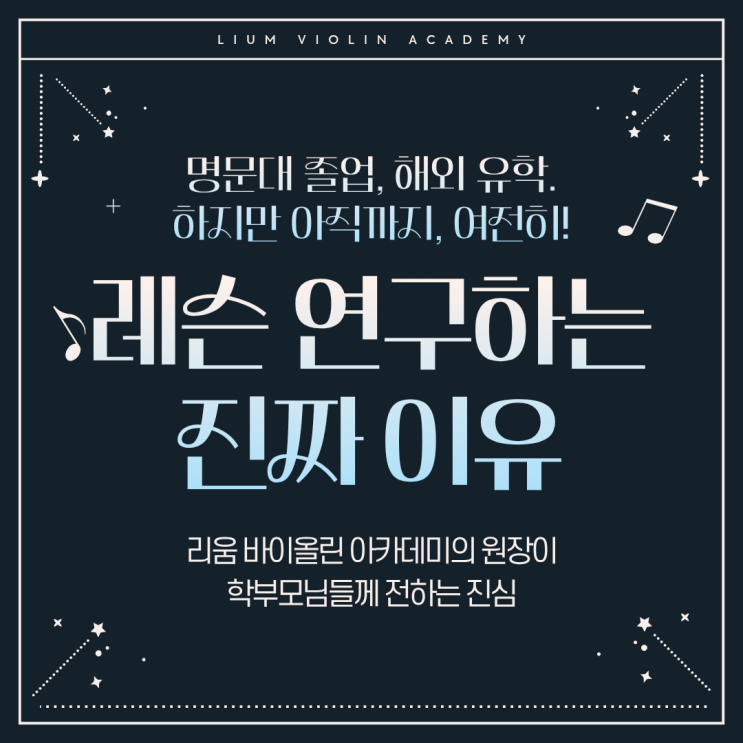 안녕하세요. 리움 바이올린 아카데미 음악학원입니다! 가끔 학부모님들께 이런 질문을 받습니다. “원장님은 서울예고, 연세대, 해외 유학까지 다녀오셨는데 왜 아직도 그렇게 레슨을 연구하세요?” 솔직히 말씀드리면, 저는 ‘다 이뤘다’고 느껴본 적이 없습니다. 오히려 가르치면서 더 많이 배우고 있습니다. 오늘은 제가 살아오고, 아이들을 가르치며 느낀점을 말씀드려보고자 합니다! 서울예고 → 연세대 → 해외 유학 그리고 마주한 ‘한계’ 좋은 환경에서 배웠고, 좋은 선생님들께 지도를 받았습니다. 하지만 현장에서 아이들을 가르치며 한 가지를 깨달았습니다. “좋은 연주자가 되는 과정”과 “좋은 교육을 받는 과정”은 다를 수....... <img src="https://blogthumb.pstatic.net/MjAyNjAyMjRfMjMy/MDAxNzcxOTE1MTIzNDI3.VqH_9e9xNCnMCKVcx7kd5tHQ9EwlLkyF13z9Uxqx7s8g.8GKRO2TSmARysB_3mAfeqP3OFuxLmXQ6xrv5mvbMrRMg.PNG/%BD%E6%B3%D7%C0%CF%BF%EB_%B4%A9%B8%AE_%2854%29.png?type=s3" />