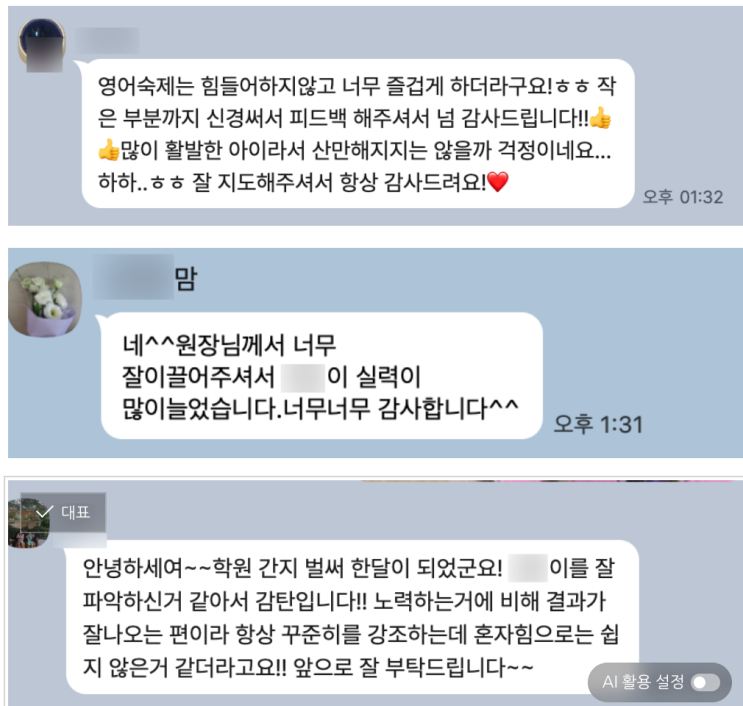 침산동영어학원을 운영하면서 가장 긴장되고 뿌듯한 순간은 상담이 아니라 이런 메시지를 받을 때입니다. 영어 숙제를 힘들어하지 않고 즐겁게 해요.!!! 한 달 만에 아이 실력이 많이 늘었어요.!!! 칭찬은 감사하지만, 저는 늘 이유를 먼저 생각합니다. 왜 달라졌는지. 무엇이 작동했는지. 그게 설명되지 않으면 오래 가지 않기 때문입니다. 아이의 변화는 우연이 아닙니다. 관리의 결과입니다. 저희 학원은 숙제를 무조건 많이 주지 않습니다. 대신 적은량이라도 의미 있게 냅니다. 오늘 배운 문장을 정확히 이해했는지, 단어를 그냥 외운 게 아니라 쓸 수 있는지, 작은 부분까지 체크합니다. 학부모님들이 말씀하시는 “세세한 피드백”은 사실....... <img src="https://blogthumb.pstatic.net/MjAyNjAyMjZfMTQ2/MDAxNzcyMDY0NDkyNDg1.O_2xybs0cBqaJCgDHGZ1drF6Yc8iBgMX32FGbQT9oRIg.HisW3cOy2V2n9J6jVbmZc5D8724dR6xiF0kaVaiCscog.PNG/%BD%BA%C5%A9%B8%B0%BC%A6_2026-02-26_%BF%C0%C0%FC_9.08.09.png?type=s3" />