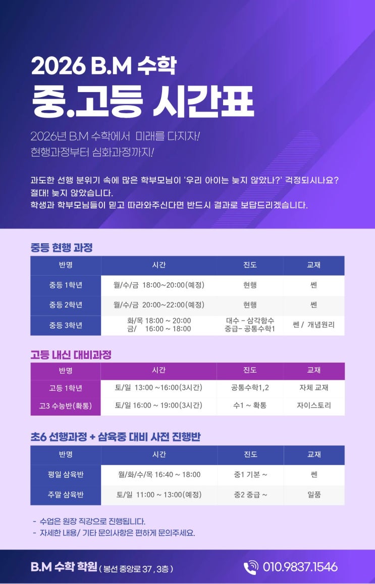 안녕하세요! B.M수학학원 곰선생입니다. 정말 오랜만에 글을 올리게 되었습니다. 학생들에게 정말 중요했던 겨울방학인만큼 정신없이 달리다보니 벌써 2번째 학기를 맞이하고 있군요. 오늘은 신학기 시간표를 알려드리고자 글을 쓰게 되었습니다. 사진처럼 시간표가 구성되었구요. 혹시 문의사항이나 자세한 부분, 혹은 진도가 미묘하게 달라 고민이신 학부모님이라면 연락주세요. 보충수업 및 추가 과제 일정이 맞다면 충분히 가능합니다. <img src="https://blogthumb.pstatic.net/MjAyNjAyMjZfMTY2/MDAxNzcyMDk2NDg2OTQ4.082cjhYEhZQPCojZ9stCWCjPmTMSRPqRcDPIO0r-OPYg.j-CYDJI--DMb4_cVjU6Q2uHH3Cnvbzq6QIlXHQaHhGog.JPEG/26_%C7%D0%BF%F8%B0%AD%C1%C2_%282%29.jpg?type=s3" />