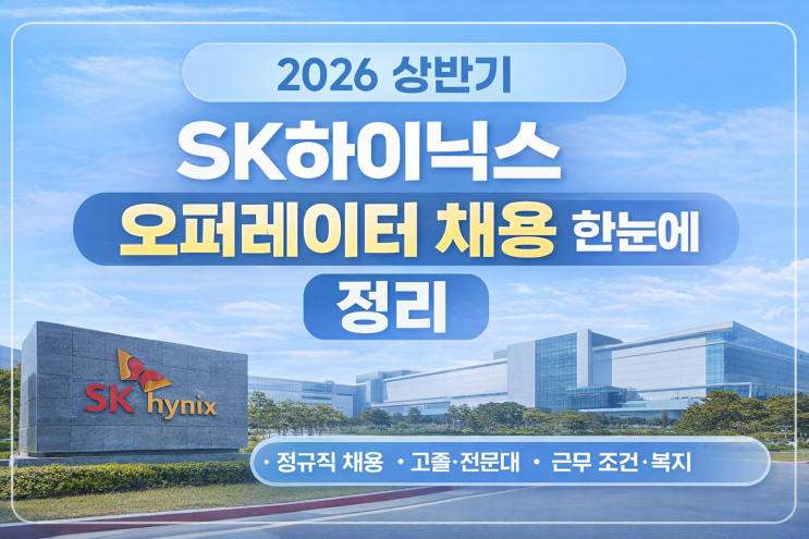 반도체 대기업 취업을 준비 중이라면 한 번쯤은 꼭 살펴보게 되는 기업이 바로 SK하이닉스입니다. 이번에 2026년 상반기 오퍼레이터 (Operator) 정규직 채용 공고가 공식적으로 공개되어, 지원 조건부터 근무 형태, 복지까지 한 번에 정리해 봤습니다. 특히 고졸, 전문대졸 지원 가능, 경력 무관, 정규직 채용이라는 점에서 관심 가지는 분들이 많을 수 밖에 없는 공고입니다. 지원기간 및 접수 방법 지원기간 2026.01.02(금) 09:00~ 2026.01.12(월) 17:00 지원방법 SK Careers 채용 사이트를 통한 온라인 지원 채용형태 정규직 (2026년 3월 입사) *마감 시간 이후에는 접수가 불가하므로 여유 있게 제출하는 것을 추천드립니다. 모집 직....... <img src="https://blogthumb.pstatic.net/MjAyNjAxMDZfNjEg/MDAxNzY3Njc5MzYzMDk5.LY8E0wl9-3Vf92agkgxT3eXitP9HB1elDC-R6b7xX2Yg.xNF_fVqhCh1TSN1Z1h_DIaNCo5WSHoPGEMJW8NMJ3_Qg.PNG/sk%C7%CF%C0%CC%B4%D0%BD%BA_%C3%A4%BF%EB_%BD%E6%B3%D7%C0%CF.png?type=s3" />