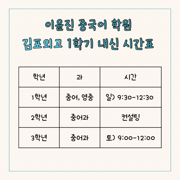 안녕하세요 이윤진 중국어 학원입니다. 김포외고 26년 1학기 시간표 안내드립니다 ♡ 개강일은 개별 안내드리도록 하겠습니다. 감사합니다 최선의 선택을 위한 귀한 고민의 시간을 보내는 중이시라면, 방학 특강 30분 무료 청강 가능합니다. 기간 : 2월 넷째 주 상담 후 시간 안내드립니다. 과외와 학원의 장점만 쏙쏙! 수업 문의 및 상담 010. 3020. 6238 <img src="https://blogthumb.pstatic.net/MjAyNjAyMjFfMjgy/MDAxNzcxNjQ1MzEwOTIx.2Qj3VMe9S3HQONU50qsXazLlD0C8RtT6jo4Qf2wY0r0g.LZG9XJH0CB5Ua_ssNC9E65P_HNXjJDhBk-nv9TNGrNAg.PNG/image.png?type=s3" />