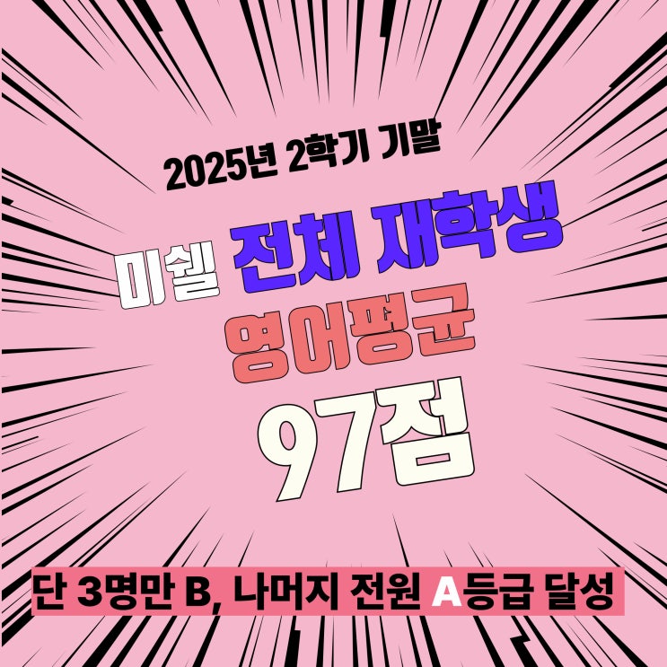 안녕하세요! 미쉘의 미쉘입니다~ 이번 2학기 기말은 난이도가 높게 출제된 학교들이 꽤 되었어요. 특히 서술형 수준도 다소 올라간 학교가 보여 아이들 학습에 도움이 되어 좋습니다. 우리 미쉘 재원생들의 영어 성적 집계가 오늘로서 마무리 되었습니다! 일단, 중2 아이들은 전원 A등급이고, 평균은 97점! 중1 아이들은 이번이 첫 시험이였는데 다들 잘 해 주었어요. 평균 소수점 빼고!! (반올림 안시키고) 전체평균 97점입니다! 미쉘 재원생 전체 학생들의 평균은 무려 97점! -- 이 성적은, 영어 공부를 전혀 해보지 않은, 영어학원이 미쉘이 처음인 학생들의 성적도 포함하여 이룬 결과라 더욱 뜻깊다고 생각됩니다. 스스로 열심히 하고자 하....... <img src="https://blogthumb.pstatic.net/MjAyNTEyMThfMjUz/MDAxNzY2MDQzMTQyMjMz.10Ok3Lcl6ytT7mI_z5TKQ8AtVkpRKfpcUq2GcgBhy58g.sJwRSWe-OYymosVlk3oje5P2BSSsGEX8286HExmZ9IAg.JPEG/%B9%CC%BD%A9%C0%D7%B1%DB%B8%AE%BD%AC-004_%281%29.jpg?type=s3" />