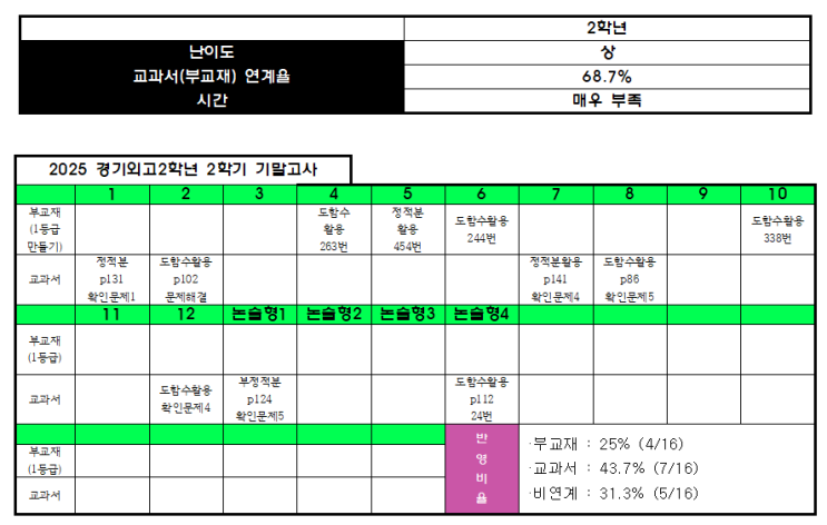 01 문항분석 02 총 평 경기외고 2학년 2학기 기말고사는 수치보다 체감이 더 강하게 남는 시험이었습니다. 연계율은 68.7%. 이 숫자만 놓고 보면 애매해 보일 수 있지만, 경기외고 시험 흐름을 기준으로 보면 분명히 낮은 편입니다. 그동안 경기외고 2학년 시험은 출제 경로가 비교적 명확했고, 반복되는 패턴이 있었습니다. 학생들 역시 “어디서, 어떤 방식으로 문제가 나올지”에 대한 감각을 어느 정도 가지고 시험장에 들어갔습니다. 하지만 이번 기말고사는 그 감각이 거의 통하지 않았습니다. 연계 자체가 끊겼다기보다는, 기존에 익숙했던 연계 방식이 깨진 시험이었습니다. 그래서 문제를 풀면서도 “분명 배운 내용인데 왜 이렇게 낯설....... <img src="https://blogthumb.pstatic.net/MjAyNTEyMTlfMjIx/MDAxNzY2MTQ1OTIxMzA3.bjfgTQ1gagLKaAkq-Ldo1DZMIe8SrkM4EegKvjSa4ssg.fDf-KBQXnd5HAlqW9bkY5VytlqNmhMuM-r9ePaq4AdUg.PNG/image.png?type=s3" />