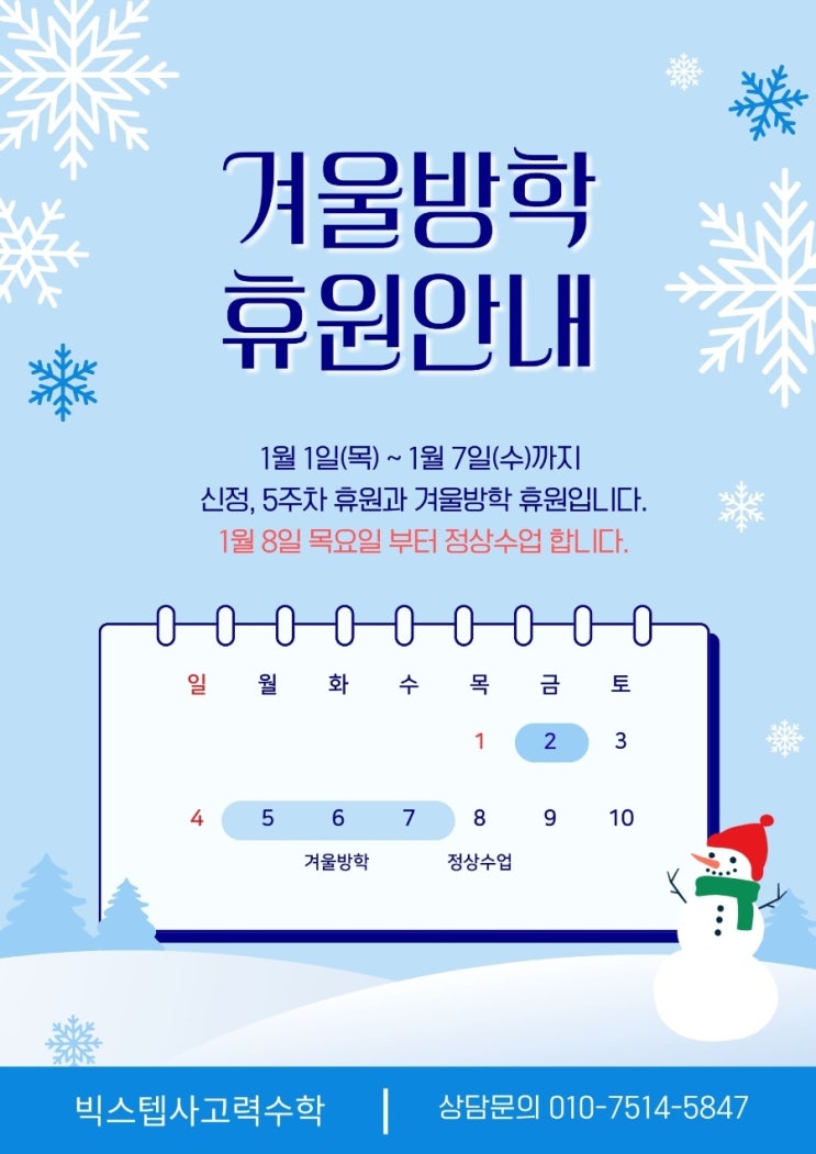 겨울방학 휴원일 안내드립니다. 1월8일 목요일부터 정상수업 진행됩니다. 상담 및 체험 수업 문의 01075145847 #다산플레이팩토 #다산요리수연산 #다산유치초등수학학원 #다산사고력수학 #다산씨투엠수학 #다산씨투엠RAT #다산심화사고력수학 #다산교과수학 #다산교구사고력수학 #다산새봄초등학교 #다산가람초등학교 #다산도농초등학교 #다산유치원 #다산새봄유치원 #다산지면사고력수학 <img src="https://blogthumb.pstatic.net/MjAyNTEyMzFfMTgz/MDAxNzY3MTc3MTIwOTEy.PqdjLuw8j9kUO1SGlt9otiBBicOI3I-qpCmNS9s-Rd0g.9_eq6yvMNerJLXlppYltJYOlurcrPClvDYnfgAmv9ecg.JPEG/900%A3%DF1767172940033.jpg?type=s3" />