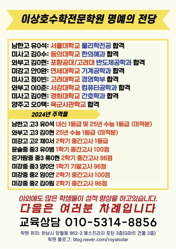 안녕하세요? 하남미사 학부모님 및 학생 여러분 하남미사 대입수학전문학원 미사페르마고등관입니다. 오늘은 미사페르마고등관에 보람차고 행복한 소식에 너무 기쁜 나머지 여러분과 그 기쁨을 함께 나누고자 합니다. 교대 5관왕 달성, 미사고등학교 조자윤 미사고등학교 조자윤 학생은 예비고1때부터 미사페르마고등관과 함께 학습하였습니다. 수학이라는 과목에 본인이 자신감이 부족했던 학생이었습니다. 그러나, 꾸준하게 흔들림없이 3년동안 미사페르마고등관의 커리큘럼을 학습해나가면서 교대 5관왕을 달성하게 되었습니다. 참고로, 조자윤 학생의 오빠도 미사페르마고등관에서 학습하고 2024년도 연세대학교 전기전자공학부에 합격했으니....... <img src="https://blogthumb.pstatic.net/MjAyNTEyMTNfMTk3/MDAxNzY1NjE1ODAwMzY4.TZ4p0-3t6a-L52KA7lO9B6JQo4WkXyX-tI6UHtOJ0WMg.eQ4gbxWMVm5Ki4xLtrCAEjWzujchBgL4d8qa2p62EGcg.JPEG/227.%B7%F9%C1%F6%C8%C6%C1%B6%C0%DA%C0%B1%28%BA%ED%B7%CE%B1%D7%29.jpg?type=s3" />