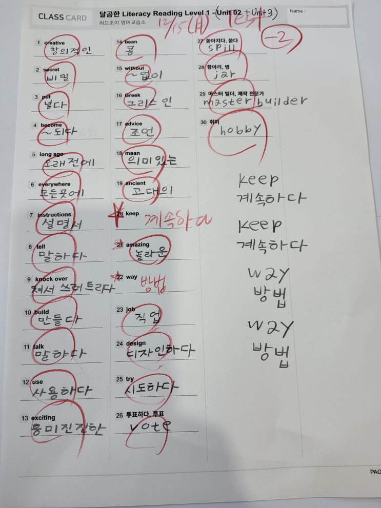 초등 5학년은 고학년으로서, 다가올 중등 공부에 그리고 멀게는 우리나라의 입시 영어에 미리 대비해야 하는 귀한 시기입니다. 입시까지 내다보며 탄탄한 영어 실력 쌓기가 목표인 위드조이에서 현재 진행하고 있는 초등 5학년 수업에 대해서 말씀드리겠습니다. 먼저 리딩은 달곰한 리터러시 라는 교재를 사용합니다. 1) 학원에 오면 먼저 온라인으로 단어를 학습하게 됩니다. => 당연히 test가 있지요. (30문제씩) 2) 선생님의 해설 강의를 듣고, 본인이 교재에 필기를 합니다. 3) 본문을 3번 읽고 옵니다. 3) 선생님 앞에 나와서 1:1로 본문의 내용을 본인이 읽고 해석합니다. 4) 온라인으로 각 문장의 배열 순서를 연습합니다. =....... <img src="https://blogthumb.pstatic.net/MjAyNTEyMTVfODAg/MDAxNzY1ODAzMDQ3MTAx.KsNop00kuotdrFOwHgSp-VosbOrbP4cAcqBvdTXO6K0g.LDirBPeDRHrzrRnd6Nq63Pxhqr3mTlTdDXk3IapoE0Eg.JPEG/KakaoTalk_20251215_214028192.jpg?type=s3" />
