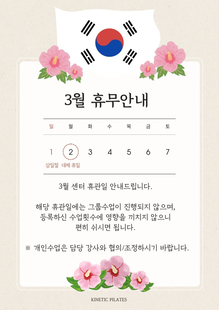 안녕하세요 :) 수지 신봉동 키네틱 필라테스 & 자이로토닉입니다. 어느덧 차가운 겨울이 지나고 조금씩 봄 기운이 느껴지는 3월이 다가왔네요. 일교차가 큰 시기인 만큼 컨디션 관리에 더 신경 써야 할 때입니다. 꾸준한 운동은 면역력 관리와 체력 유지에 큰 도움이 되는 거 아시죠? 키네틱 필라테스는 3월에도 안전하고 체계적인 수업으로 회원님들의 건강을 책임지겠습니다 :) 3월 휴무 일정 안내 ✔ 3월 2일(월) ※ 해당 날짜에는 그룹 수업이 진행되지 않으며, 등록하신 수업 횟수에 영향을 끼치지 않으니 편히 쉬시면 됩니다. ※개인수업은 담당 강사와 협의 / 조정 하시기 바랍니다. 휴무 전후로 스케줄 변동이나 예약 관련 문의 있으....... <img src="https://blogthumb.pstatic.net/MjAyNjAyMTNfOTgg/MDAxNzcwOTcyMDAwMzEy.crSmHBjDpLZGx7pq4yXImXdTysTiA18e_BzczdsRg0Mg.lVB4TZJx0FSBHPj39ikJOOwjaHnRxTyfEIUKtrafFMgg.JPEG/26%B3%E23%BF%F9_%C8%DE%B9%AB.jpg?type=s3" />
