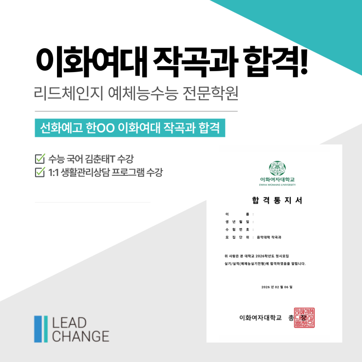 안녕하세요! #예체능입시 #예체능수능 #예체능정시 #음대입시 #음악대학 #음대정시 #음대수능대비 #선화예고 #선화예고국어학원 #선화예고영어학원 #아차산수능학원 #광진구정시학원 #강동구정시학원 #이화여대 #이대 #작곡과 #작곡과입시 리드체인지예체능 수능전문학원입니다. 한 해 동안의 준비가 결실을 맺는 순간, 리드체인지 예체능수능전문학원에서도 반가운 소식을 전하게 되었습니다! 이화여대 작곡과 합격 소식을 전해드리려고 합니다. 정말 축하합니다~! 선화예고 음악과 한OO 학생 ✨이화여자대학교 작곡과 최종합격을 축하합니다✨ 선화예고 음악과 한OO 학생은 ✅ 리드체인지 김춘태T 국어 수업과 ✅ 리드체인지 1:1 생활관리....... <img src="https://blogthumb.pstatic.net/MjAyNjAyMDlfNDIg/MDAxNzcwNjQxNjk3MDk3.kfIQDD0Q0kV0IXAukV_eFjlNF7ebKChY43KScKdC_d4g.SI5V90NOL21Bs-6urLALKikF9SDG2-g_-Z74q4I7j94g.PNG/%C0%CC%C8%AD%BF%A9%B4%EB_%C0%DB%B0%EE%B0%FA_%C7%D1%BA%B8%BF%B5.png?type=s3" />