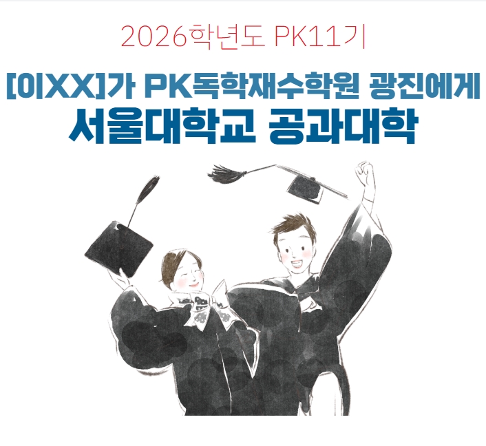 안녕하세요. 저는 2025년에 PK독학재수학원 광진본원에서 공부했고, 이번에 원하는 대학에 합격하게 되어 이렇게 합격수기를 남깁니다. 사실 수험준비를 다시 시작할 때는 막막했습니다. 재종은 너무 답답하고 독서실이나 관스카는 혼자 공부해야 한다는 부담도 있었고, 무엇보다 현역, 재수 실패 경험 때문에 자신감도 많이 떨어져 있었습니다. 그런데 학교선배 소개로 왔던 PK에서 공부는 결국 관리받는게 중요하다는 걸 확실히 느꼈습니다. PK독학재수학원 광진본원이 도움이 되었던 점 1) 원장님과 선생님들 역할 PK에서 가장 도움이 되었던 건 원장님과 선생님들의 관리 방식이었습니다. 다른 독학재수학원이나, 관리형학원들처럼 출결만 확....... <img src="https://blogthumb.pstatic.net/MjAyNjAyMDlfNzUg/MDAxNzcwNjEzNjAzNTc0.rKNgDkJ6Cs9HT6EOPF81g89Z1WLMM87tYJfUb2yWZoog.mCLddzyV6z53YPo522r0LDvGc3MycOy2-QLDN__3Aiog.JPEG/2026_%BC%AD%BF%EF%B4%EB%C7%D0%B1%B3_%B0%F8%B0%FA%B4%EB%C7%D0.jpg?type=s3" />