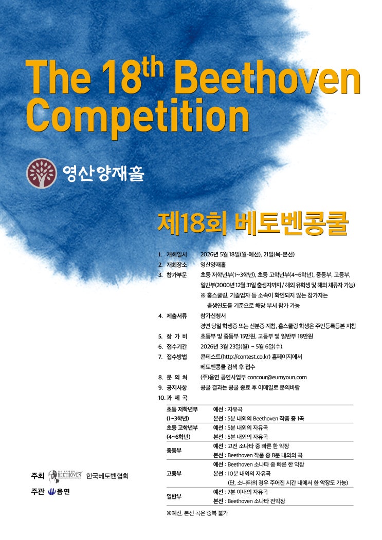 안녕하세요, 즐거운 나를 음악으로 표현하는 라온제나예요~~~ 지난번에 이화경향콩쿨에 대해서 포스팅을 했는데요, 오늘은 이제 막 접수가 시작된 베토벤 콩쿨에 대해서 알아볼께요. 베토벤 콩쿨은 올해로 18회를 맞이했는데요, 예선은 5월 18일 월요일, 그리고 본선은 21일 목요일에 열립니다. 학기 중인데 평일에 열리는군요. 장소는 양재역 근처에 있는 영산양재홀입니다. 몇 년 전에 리모델링을 한 이후 홀이 많이 예뻐지고 음향도 좋아졌더라구요. 참가부문 참가부문은 모두 5개로 나누어지는데요, 초등 저학년부, 초등 고학년부, 중등부, 고등부, 그리고 일반부입니다. 일반부는 2000년 12월 31일 출생자까지 가....... <img src="https://blogthumb.pstatic.net/MjAyNjAzMjlfMjU1/MDAxNzc0Nzc4NzQ4NTM4.pCxtIRc6y-T-YuIHZUknpK6d_gbsvNf_iGsJwymEgdwg.8EPD2G6RW7-fWbTr5jEn27d16WvmCYl72vh4pqFEsV0g.JPEG/20260319123448530.jpg?type=s3" />