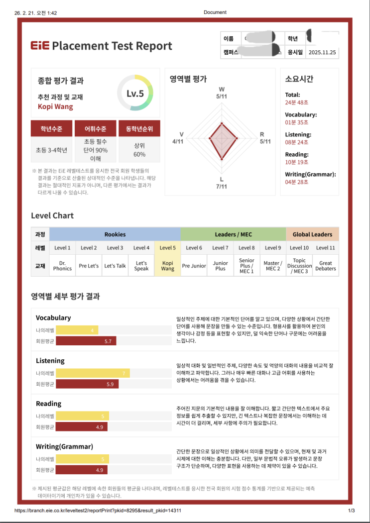 EiE 직산 캠퍼스 레벨 테스트 안내 ~~ 초등·중등 학생의 영어 실력을 정확히 진단해 아이에게 맞는 반과 학습 방향을 제시합니다. 우리 아이에게 꼭 맞는 영어 레벨, 어떻게 결정될까요? 천안 직산·성거 지역에서 초등·중등 영어 학원을 고민 중인 학부모님들께 EiE 직산 캠퍼스의 레벨 테스트 시스템을 안내드립니다. 신학기를 앞두고 상담을 진행하다 보면 가장 많이 듣는 질문이 있습니다. “우리 아이, 지금 영어 수준이 어느 정도인가요?” “파닉스부터 해야 할까요, 아니면 말하기 수업이 맞을까요?” EiE에서는 이 질문에 경험이나 감이 아닌, 데이터 기반 진단으로 답합니다. EiE 레벨 테스트란 무엇인가요? EiE 레벨 테스트는 학생의 영....... <img src="https://blogthumb.pstatic.net/MjAyNjAyMjFfMjEw/MDAxNzcxNjA2MzU4NDkw.HV1DkdLL-XnljEREZk90E9D0PI-CgRlQshIkGKfCk64g._WNe2ZaLPauRq1ZggU3GYQND3eyvQbxp5Ot4XYHRKXcg.PNG/AI_%B7%B9%BA%A7_11.png?type=s3" />