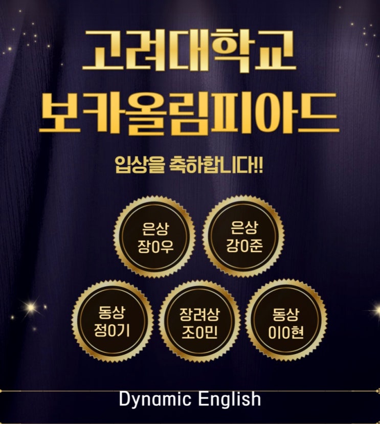 안녕하세요, 다이나믹 잉글리쉬입니다 이번 보카올림피아드 성적이 발표되었습니다. 방학 특강 동안 누구보다 성실하게 준비해온 우리 아이들의 결과를 기쁜 마음으로 전해드립니다. ✨ 은상 2명 ✨ 동상 2명 ✨ 장려상 1명 무엇보다 더 자랑스러운 점은, 이번 도전은 단순한 ‘응시’가 아니라는 점입니다. ✔ 파닉스반 학생들도 용기 있게 도전했고 ✔ 자신의 학년보다 한 단계 높은 레벨에 도전한 친구들도 있었습니다 결과도 물론 소중하지만, 저는 이번 과정을 통해 아이들이 보여준 태도와 성장을 더 크게 보고 있습니다. 500개가 넘는 단어를 반복해서 읽고, 틀리면 다시 외우고, 포기하지 않고 끝까지 완주해낸 그 시간들… 그 시간....... <img src="https://blogthumb.pstatic.net/MjAyNjAyMTBfMjc5/MDAxNzcwNzEyMDE0MTYw.TAzLda_bQ0Ajq_bvmYAGJy5BZWpdu2Lyc8H2n741YbEg.AMJ01wn7GSG_QRf9VO-tbL0hyDrxjN_tuswYWutx8F8g.JPEG/KakaoTalk_20260210_172633189.jpg?type=s3" />