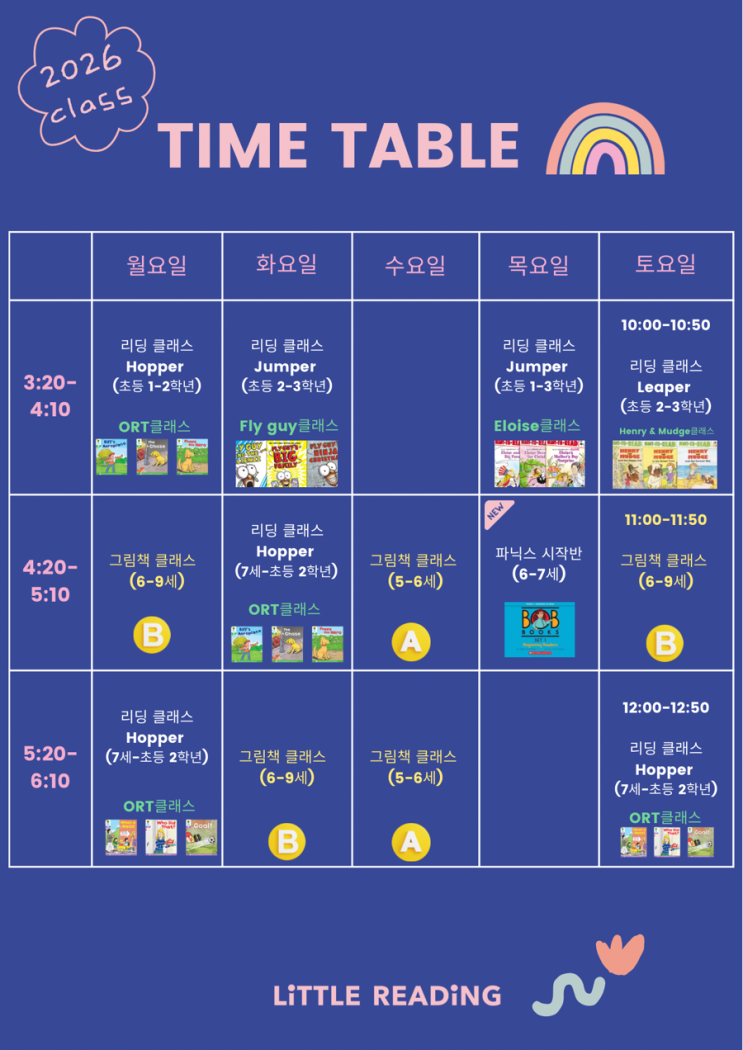 2026학년도 리틀리딩 클래스 안내입니다^^ 반별 소개를 읽어보시고 우리아이에겐 어떤 클래스가 맞을지 생각해보시면 좋을 듯 합니다. ——————————————————————————— 리틀리딩은 2020년 그림책 클래스로 시작하여 아이들에게 긍정적인 영어정서를 느낄 수 있도록 영어학습의 마중물이 되도록 노력하고 있습니다. 영어라는 언어를 지속할 수 있게 긍정적인 영어 감정을 채워주는 그림책 클래스와 알파벳 4개의 소리로만 첫 번째 책을 읽으며 책 한 권을 읽었다는 성취감을 통해 작은 성공 경험을 켜켜이 쌓아갈 수 있는 리딩 클래스가 진행되고 있습니다. (리딩 클래스 레벨: 리딩 시작반 ⭢ Hopper ⭢ Jumper ⭢ Leape....... <img src="https://blogthumb.pstatic.net/MjAyNjAyMTFfMTUx/MDAxNzcwNzc2NzQzNDc1.M6XT_38ytqrc1-bu49fa2F3FOCUlirjMBpw2ewqlJ14g.GfWTRiamTZ34J8UNnt0ib0gi7jSAzWm-xLu-nkz_ZQ4g.PNG/2026_%BD%C3%B0%A3%C7%A5.png?type=s3" />