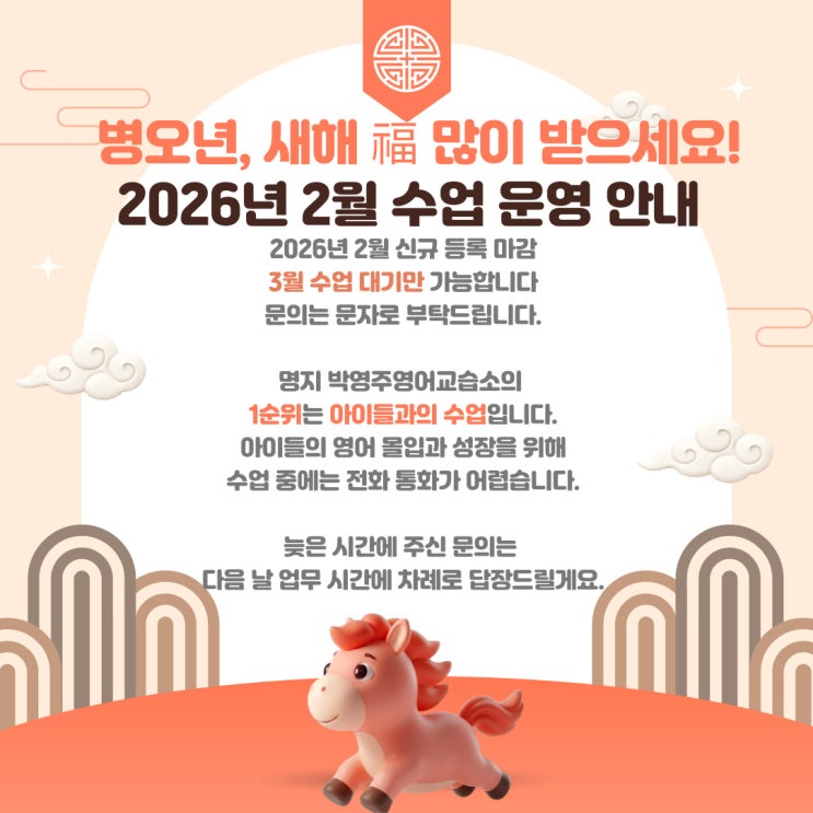 2026년 새해 복 많이 받으세요. 박영주영어교습소 공지 안내 2026년 2월 신규생 모집은 등록 마감되었습니다. 많은 관심과 성원 감사드립니다. 2025년 개정 교과서로 첫 시험을 치른 중학교 1학년 학생들 (초등학생 때부터 함께해 온 아이들)이 "평균 94"점을 기록했습니다. 또한 고등학교 1학년 학생들 중 내신 영어와 모의고사 모두 "1등급"을 달성한 학생도 있습니다. 그 결과, 박영주영어 학생들은 막연한 선행학습이 아닌, 영어의 본질을 이해하며 탄탄하게 쌓아가는 공부가 얼마나 중요한지를 결과로 증명해 보였습니다. 이러한 수업 방향을 바탕으로, 3월 개강 신규 TO를 안내드리고자 합니다. 3월 개강 신....... <img src="https://blogthumb.pstatic.net/MjAyNjAyMTFfMjUw/MDAxNzcwODEzODA5NTAz.7O4uGqgPfJKKOlmKybO4lqBM-8A9f54AWYTigusSkw8g.b1_mdxBs0R1SSqEFSkDJwQYhGZKy-kHsl5HKwCvn3iMg.JPEG/2026%B3%E22%BF%F9%B8%B6%B0%A8%BE%C8%B3%BB.jpeg?type=s3" />