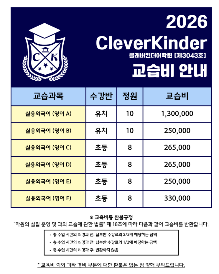 2026년도 교습비 공지 [클래버킨더어학원, 제3043호]