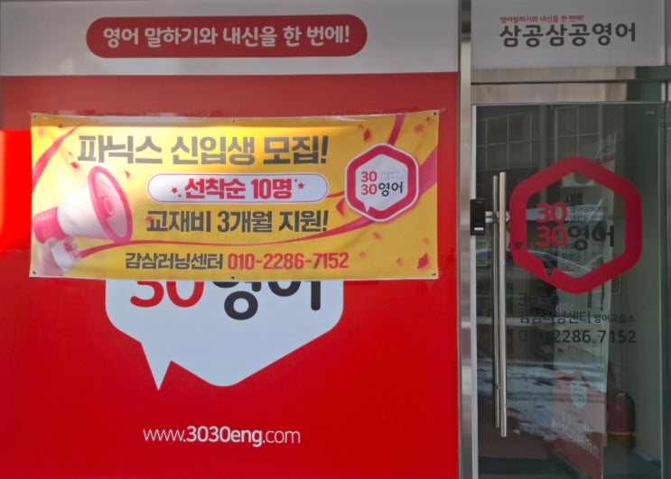 안녕하세요~ 3030영어 감삼러닝센터의 Joy t.입니다. 파닉스 처음이라면 지금이 기회! 저희 센터에서는 2,3월동안 파닉스 신규 등록시 교재비 지원 혜택 제공합니다. 소리부터 읽기까지 체계적인 수업으로 아이의 영어 기초를 탄탄하게 만들어 드립니다! ※본 혜택은 파닉스 신규 등록생에 한해 제공되며 한정으로 마감될 수 있습니다. 감삼동에서 만나는 3030영어는 11년 연속 브랜드 대상을 수상한 영어 교육 브랜드 입니다. 오랜 시간 검증된 커리큘럼과 학습 시스템으로 아이들의 영어 기초부터 실력까지 책임지고 있습니다. ABC를 배우든, 중등 내신 심화 과정을 배우든 모든 아이가 매일, 자기 목소리로 발화 해야만 집에 갈 수 있는 시스....... <img src="https://blogthumb.pstatic.net/MjAyNjAyMDRfMTAx/MDAxNzcwMTc4NTE2Mjk2.B8NV8Dudj8bXG1Sjp7exX95WCo8M88C-PIGRgfU7lMMg.R_lgYXaLtUoyuWafstZ4WtlTvMqePNdfYY22ZFTFCBUg.JPEG/%BA%ED%B7%CE%B1%D74.jpg?type=s3" />