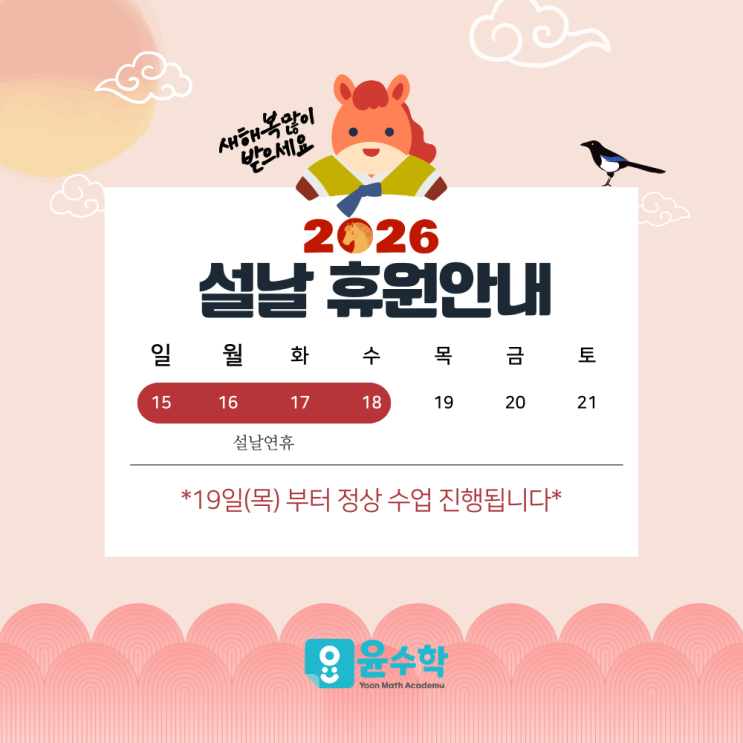 안녕하세요 월성동 수학학원 윤수학입니다 설날 휴원 일정 안내 드리겠습니다. 2월 15일 (일) ~ 2월 18일(수) 휴원 행복한 설 연휴 보내세요! <img src="https://blogthumb.pstatic.net/MjAyNjAyMTJfMTI3/MDAxNzcwODc0ODE5MTc2.g_T-6NnYqR3KlfWtWFyeG8OfLx2YmepdsWM-YE2HebAg.8ui7_Pq7lOiz9jaaC6zYKkMa3bxcBg2IWytAJLcVgO0g.PNG/%BC%B3%BF%AC%C8%DE%BE%C8%B3%BB.png?type=s3" />