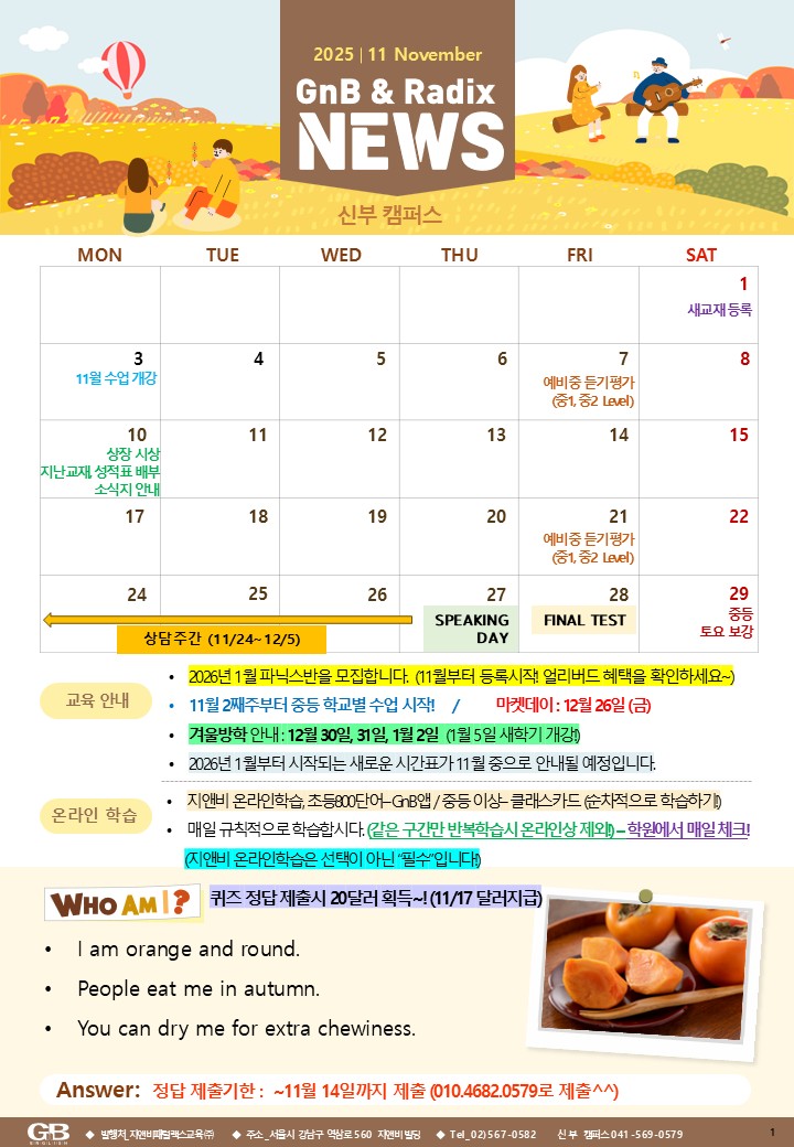 11월 소식지 [신부동 지앤비 영어학원 / 신부GNB]