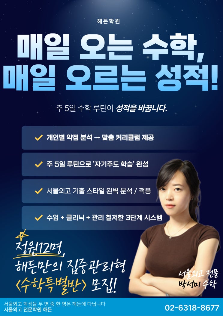 안녕하세요. 서울외고 전문학원 해든 입니다. 예비고1 박성미선생님의 매일오는(주5일) 수학! 12명정원 해든학원만의 커리큘럼으로 수학 집중관리 <수학특별반> 을 안내 드립니다. 박성미T 수학특별반 월/화/수/목/금 13:00 - 16:00 (1월 1~2주차는 저녁에 보충수업) 개강일 12/29(월) 수강신청 및 기타문의는 학원으로 문의 주시면 자세하게 상담드리겠습니다. 02.6318.8677 <img src="https://blogthumb.pstatic.net/MjAyNTEyMDdfNDgg/MDAxNzY1MDY4MTU4MzYw.7-FppgSOBpe2gnAJhsyKXJVP4SXgLUM3dSVKHqOrMBgg.TVka5nhuy5WJ-o1_cgRcHIP6gvdzliDa9cL4ZQa0zqEg.JPEG/%C7%D8%B5%E7%C7%D0%BF%F8_%B9%DA%BC%BA%B9%CCT_%BC%F6%C7%D0%C6%AF%BA%B0%B9%DD.jpg?type=s3" />