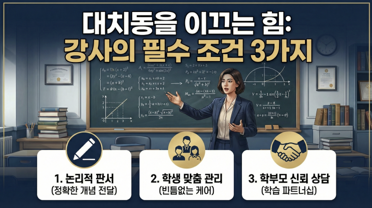 최상위권 학생을 만드는 강사의 필수 조건 3가지 대한민국 교육의 중심, 대치동. 이곳은 매년 가장 많은 최상위권 학생들을 배출해 내는 상징적인 지역입니다. 대치동이 이토록 강력한 힘을 발휘하는 이유는 무엇일까요? 단순히 학원이 많아서만은 아닙니다. 그곳에는 좋은 선생님부터 시작해 열정적인 학생, 헌신적인 학부모, 체계적인 학원 시스템, 전문적인 실장님과 컨설팅, 그리고 우수한 교재까지... 교육을 둘러싼 모든 요소가 다른 지역에 비해 훨씬 전문화되고 다양하게 갖춰져 있기 때문입니다. 하지만 이 모든 인프라 속에서도 **교육의 본질은 결국 '강사'**에게 있습니다. 오늘은 우리 아이를 최상위권으로 이끌기 위해 강....... <img src="https://blogthumb.pstatic.net/MjAyNTEyMDhfMTE1/MDAxNzY1MTk5NTEzMTU0.NlpNSJDC5Nu9GvfABdQbduXnt3KDx1g94VMT4sPXu-og.u0qoxzFpY4FNJwsWPw-_SUmGGHZhlryjVA_1rB2b30wg.PNG/%BD%BA%C5%A9%B8%B0%BC%A6_2025-12-08_%BF%C0%C8%C4_10.05.34.png?type=s3" />