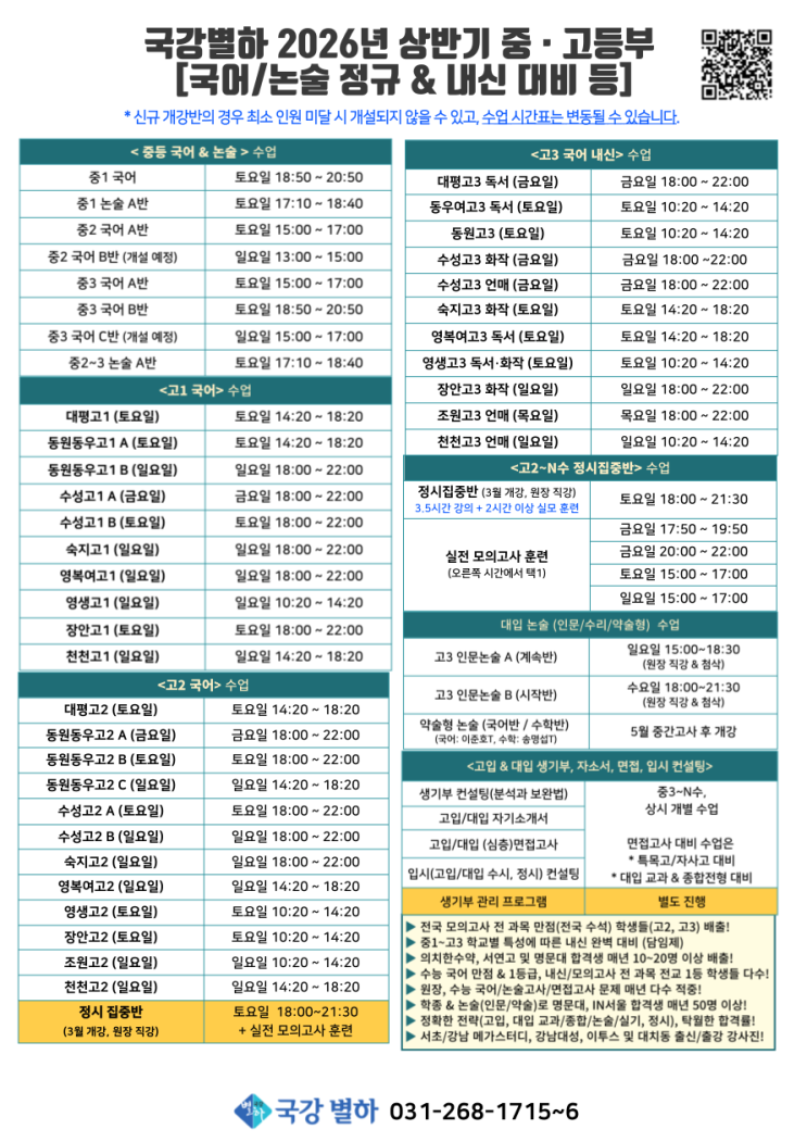 [국강별하] 2026년 3~4월 중~고등부 시간표