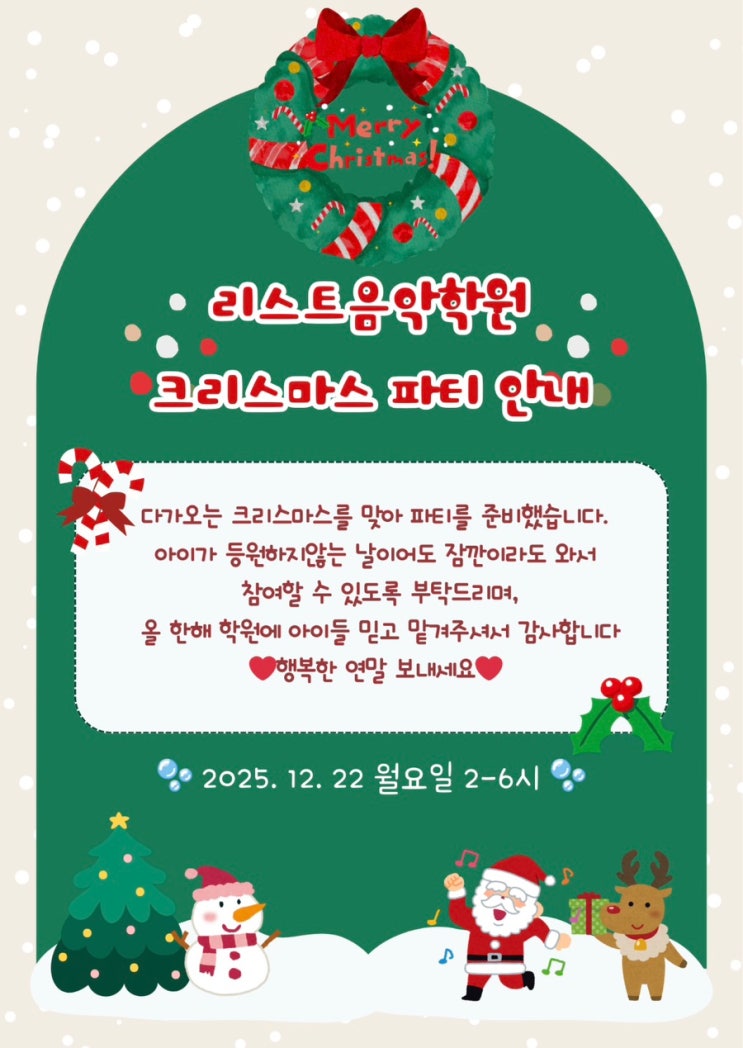 매탄동 리스트음악학원 따뜻했던 연말이야기 어느새 한 해를 마무리하는 12월, 리스트음악학원에서는 아이들과 함께 피아노 연주회 & 크리스마스 파티를 진행했습니다 피아노 연주회 먼저, 한 해 동안 열심히 연습해 온 곡을 한 명 한 명 무대에서 연주하는 시간을 가졌어요~ 작은 손으로 건반을 눌러가며 집중하는 모습, 연주를 마치고 살짝 안도의 미소를 짓는 모습까지^^ 또 서로의 연주를 조용히 들어주며 응원해주는 모습에서 아이들이 음악뿐 아니라 마음도 함께 자라고 있다는 걸 느낄 수 있었답니다 부모님들께도 연말인사와 함께 아이들이 학원에서 어떻게 생활하는지, 얼마나 실력이 늘....... <img src="https://blogthumb.pstatic.net/MjAyNjAyMDdfMjQg/MDAxNzcwNDUyOTU1NjU0.Q0XL2-HTNVj_kdLL82IPXzbX3V5gsKwU65Ld1lblZe4g.CppCU2eZCzIP5ESsFztlbtew_IoPU77Kr-1xwKrMJQwg.JPEG/IMG%A3%DF1597.JPG?type=s3" />