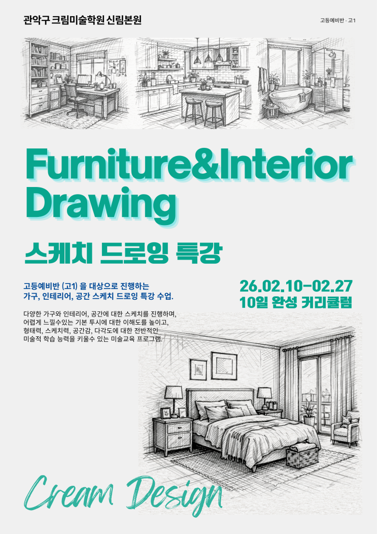 [관악구 크림미술학원 신림본원] CREAM Art Intitute 크림미술학원 신림본원 고등예비반 - 고1 학생들의 봄특강 / 드로잉 특강 Futniture & Interior Drawing 스케치 드로잉 특강 고등예비반 학생을 대상으로 진행하는 가구, 인테리어, 공간 스케리 드로잉 특강 수업. 다양한 가구와 인테리어, 공간 에 대한 스케치를 진행하며, 어렵게 느낄수 있는 기본기 투시에 대한 이해도를 높이고, 형태력, 스케치력, 관찰력, 공간감, 다각도에 대한 전반적인 미술적 학습 능력을 키울수 있는 크림만의 미술 교육 프로그램. [ 1회차 - 4회차 ] 기본기 투시에 맞춘 다양한 가구 & 인테리어 디자인 스케치 진행 테이블 디자인 / 침대 디자인 / 조명 디....... <img src="https://blogthumb.pstatic.net/MjAyNjAxMzFfMjgg/MDAxNzY5ODM5NDczNDg4.1QqEZCigb334cR1fYHnsqP8l_TikI5MORTqbdZ7UKmUg.RymhGdat8-UKjmhu7VzjjRutWFwBaRyc0cfDmJsUy4og.PNG/1.png?type=s3" />