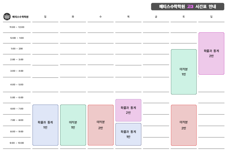 관악구 수학 메티스 수학학원 2026년 고3 시간표 안내