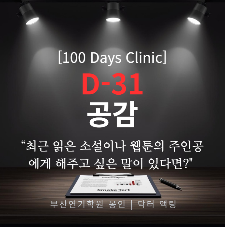 안녕하세요, 부산 몽인연기학원의 '닥터 액팅(Dr. Acting)' 이민우 원장입니다. 오늘 우리 몽인인들이 도전한 31일차 질문은 배우에게 가장 중요한 자질 중 하나인 '공감 능력'과 '캐릭터 분석력'을 엿볼 수 있는 아주 흥미로운 주제입니다. 단순히 작품을 읽는 것을 넘어, 가상의 인물에게 말을 건네는 과정을 통해 배우 지망생이 가진 정서의 깊이를 확인하는 시간이었죠. [100 Days Clinic] 31/100일차: [소설] 작품 속 주인공에게 건네는 진심 부산연기학원 몽인의 실전 분석 CONTENTS Core Value: 왜 주인공에게 말을 걸어야 하는가? [Clinic] 실전 영상 분석: 7인 7색의 진심 분석표 [Insight] 실무 역....... <img src="https://blogthumb.pstatic.net/MjAyNjAzMTdfMjE3/MDAxNzczNzQ1MDY4Mjk5.PzeDPk7fS_cqICxL4ZRORVfdWryBmBVmH218RLgS8mMg.-IGHtZxqtVHBvI7Ps28hyiURnY2R-hbLI2LpjuAdgCYg.PNG/image.png?type=s3" />