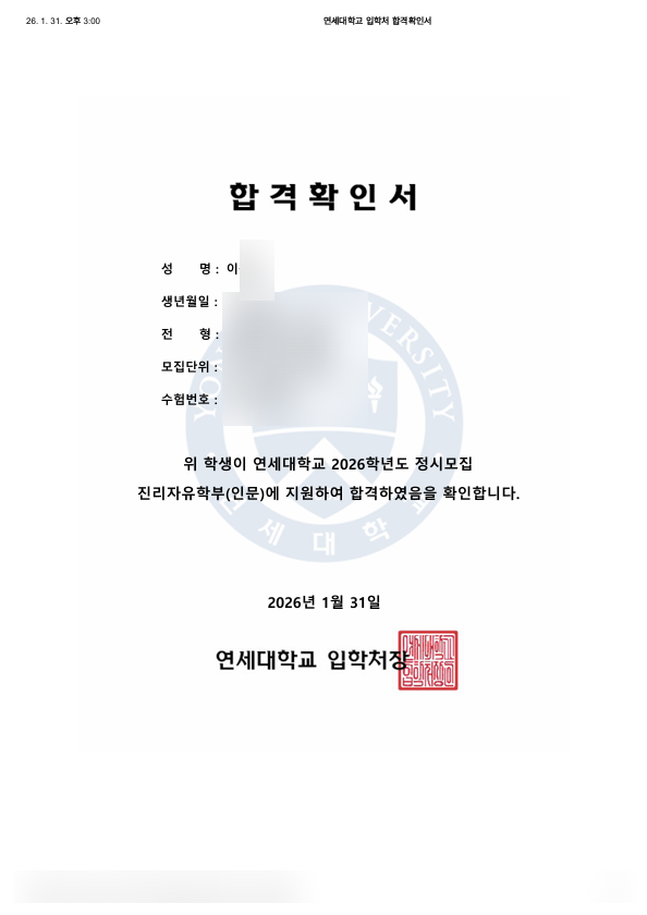 시지영어, 더마스터영어발전소 - 26년 정시, 연세대학교 합격-