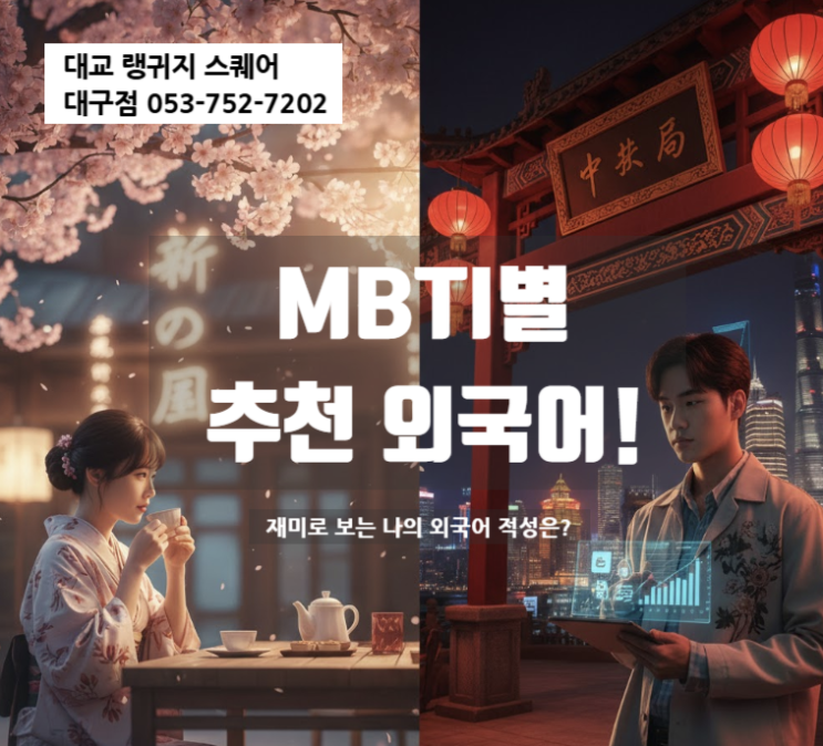 안녕하세요! 대랭스 대구점입니다. 새해 목표로 외국어 공부 세우신 분들 많으시죠? 그런데~막상 시작하려니 아직 고민중 이신가요!? 일본어가 나을지, 중국어가 나을지~~~ 고민되는 분들을 위해 준비했습니다! 재미로 보는 MBTI별 추천 외국어, 지금 바로 확인해 보세요! 중/국/어 추천!!!!! 분석형 (INTJ, INTP, ENTJ, ENTP) "논리와 효율이 최우선!" 이유: 한자라는 거대한 시스템을 분석하고, 퍼즐을 맞추듯 성조를 정복하는 과정에서 지적 희열을 느낍니다!! 학습 팁: HSK 급수 따기처럼 명확한 목표를 설정하면 광속 합격 가능! 탐험가형 (ISTP, ISFP, ESTP, ESFP) "지루한 건 딱 질색, 실전이 최고!" ....... <img src="https://blogthumb.pstatic.net/MjAyNjAyMDRfMTcw/MDAxNzcwMTk0NTE1NDAw.02ckgQmnDCapwQMy4-2OHgqNozacEajlglDtuRF5lHMg.Cv4snwYHwTmqbpsASJLZ1eNArdqpVzYmx787XK_e7Nwg.PNG/image.png?type=s3" />