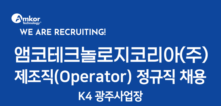 제조직 정규직 취업을 준비하고 있다면 2026년 하반기 앰코테크놀로지코리아 채용공고는 한 번쯤 확인해 볼 만한 공고입니다. 이번 모집은 광주 k4 사업장 제조직 (Operator) 정규직 채용으로, 고졸, 초대졸 학력도 지원 가능하고 신입 지원이 가능한 것이 특징입니다. 아래에서 공고 내용을 기준으로 핵심만 정리해 보겠습니다. 회사 및 채용 개요 모집분야 : 제조직 Operator 고용 형태: 정규직 근무 사업장: k4 광주사업장 채용인원: 00명 지원 마감: 2026년 1월 7일 23시 59분까지 모집 직무 및 담당 업무 제조직 Operator로 입사하게 되며, 주요 업무는 다음과 같습니다. 반도체 패키징 및 제품 생산 제품 검사 및 관리, 품질 검수 컴퓨터를....... <img src="https://blogthumb.pstatic.net/MjAyNTEyMjJfMTU0/MDAxNzY2Mzg1MDc1Mjgz.9N3ig8m_zEUDGm1pEAzbmkiEg4AH_PnTAaBzWoUD0z4g.PQCefGZqbDP1NIef7i-IEAVOI9fmrUQ8i19LsAiItnkg.PNG/%BF%A5%C5%D7%C5%A9%B3%EE%B7%CE%C1%F6.png?type=s3" />
