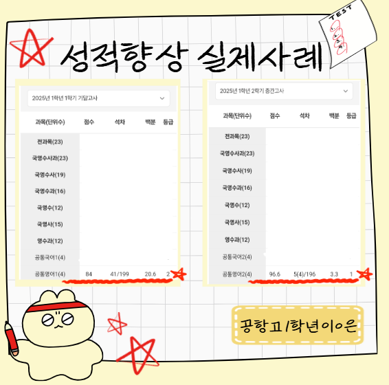 “성장은 어느 날 갑자기 오지 않아요." 2025년 공항고 2학기 중간고사가 마무리되고, 이제 곧 기말고사가 시작됩니다. 누군가는 잠시 숨을 고르고, 또 누군가는 바로 다음 시험을 준비하겠지요.? 그 분주한 시간 속에서, 저희 학원 아이들이 보여준 노력과 성장을 잠시 기록하고 싶습니다. 단순한 ‘성적 향상 사례’가 아니라, 한 명의 학생이 어떻게 마음을 단단히 다지고 일어섰는지에 대한 이야기 말이에요. ✨ [사례1.] “늘 긴장되던 시험, 이번엔 전교 5등으로 바뀌다” 이○은 학생은 학원에 2학기 중간고사 대비반부터 등원하기 시작 했어요. 우리 학원 이○은 학생은 처음 왔을 때만 해도, 시험만 보면 몸이 굳고 아는 문제도 틀....... <img src="https://blogthumb.pstatic.net/MjAyNTExMjVfMTAz/MDAxNzY0MDQ0ODg1ODQx.MKyosTra_fAVcM0m75C-OKh0tXgeJH6bFZ8xKE7sHjcg.yAeNfVMNTSLDRcUGyEscC7Uhd4x969oCo-DsJaJae78g.PNG/image.png?type=s3" />