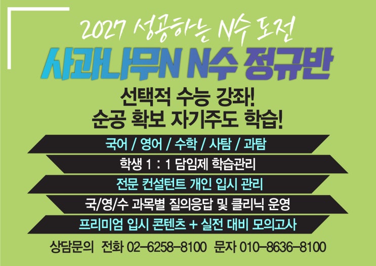 안녕하세요? 개인별 맞춤 시스템으로 N수 도전 학생을 위한 든든한 지원군 사과나무학원N입니다. 선택적 수능강좌 수강! 순공 확보 자기주도 학습! 국어/영어/수학/탐구/논술 학생 1:1 담임제 학습관리 전문 컨설턴트 개인 입시 관리 국/영.수 과목별 질의응답 및 클리닉 운영 프리미엄 입시 콘텐츠+실전 대비 모의고사 수능국어 정규시즌 개강 안내드립니다. 교육특구 전타임 마감신화 수능국어 이경태T ------------------- # 2026년 수능국어 개강 # ★개강 : 12/20(토)2시~5시 ★대상 : 예비고3,N수생 ★ 강의 내용 ★ 1. 수능국어 본질을 공부한다. 2. 지문의 범주화를 통한 수능 국어 1등급 수능원리반 개강 ★ 대상 : 예비고2,예비고1 ★....... <img src="https://blogthumb.pstatic.net/MjAyNTEyMDRfNTAg/MDAxNzY0ODUxMjc2MjA3.Lvdalsd7yw6CBGgErWClNVP2deMWzEX2G-kclwFbVTwg.Otc4KSdNjLXwpELQm-7aqFTWd23YbneuL41TOKaU8V4g.JPEG/12.4-N%BC%F6_%C1%A4%B1%D4%B9%DD_%BB%E7%C8%B8%C5%BD%B1%B8-01.jpg?type=s3" />