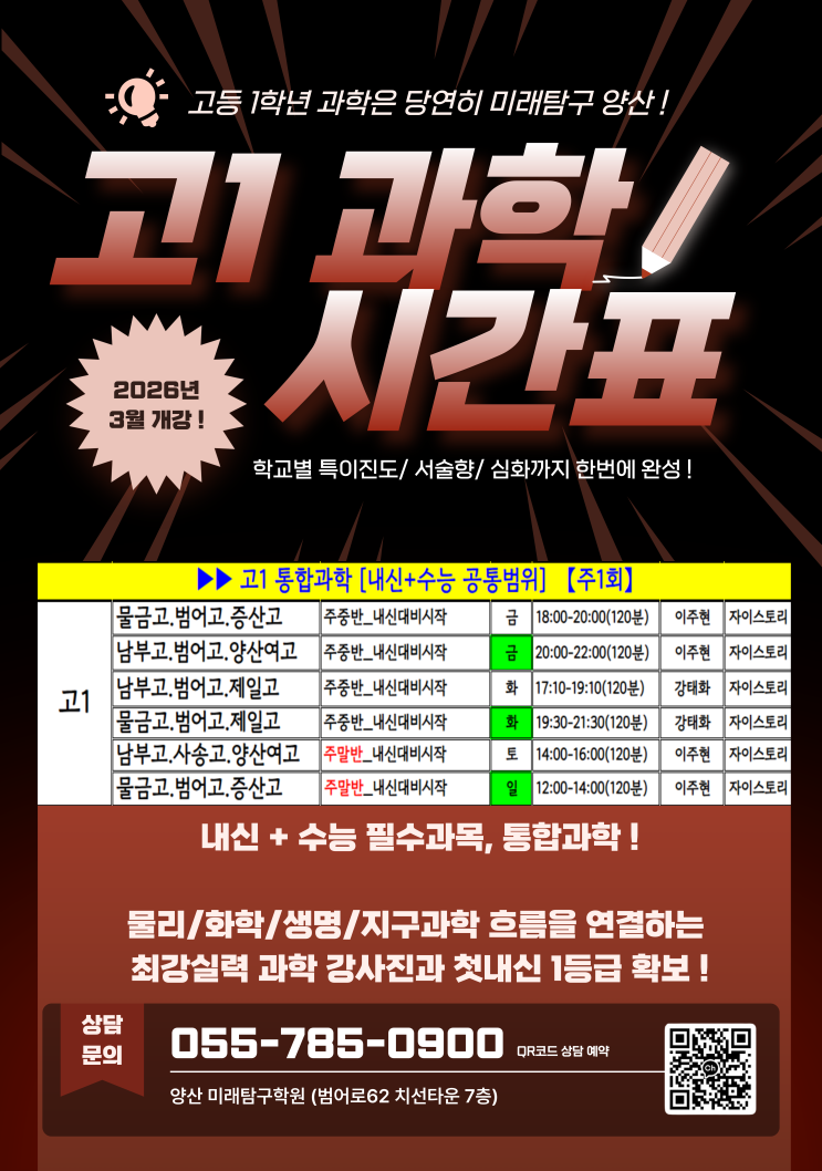 고1 과학은 당연히 미래탐구 양산 ! 내신 + 수능 필수과목인 통합과학! 물리/화학/생명/지구과학 흐름을 연결하는 최강실력 과학 강사진들과 첫 내신 1등급 확보! 학교별 특이진도/서술형/심화까지 한번에 완성 ! [ 신청 방법 ] ☎️ 학원 전화 미래탐구 양산센터 (055.785.0900) 카카오톡 채널 1:1 채팅 ▶ 전화 상담 가능 시간 평일 2:30PM ~ 9:00PM 토요일 10:00AM ~ 4:30PM 그 외 시간 및 일요일은 전화연결 안되오니 카카오톡채널 1:1채팅 [아래링크/친구추가] 문의주세요. ▼▼카카오톡채널▼▼ https://pf.kakao.com/_Hxnjxob/posts #물금 #양산 #미래탐구 #과학 #물리 #화학 #생명 #지구과학 #초등 #중등 #고등 #전문 #물금고 #양산....... <img src="https://blogthumb.pstatic.net/MjAyNjAyMjRfMjY4/MDAxNzcxOTIwNjYxMjk3.GKm6aX8UHAPRQrIETNc1FNBaUXP1kzf7MNto-XukbHMg.pp9iLEMNL2LwMUkAwPV9uJ94Grgq3zbovna3UGXqxKAg.PNG/%C1%A6%B8%F1%C0%BB_%C0%D4%B7%C2%C7%D8%C1%D6%BC%BC%BF%E4._%287%29.png?type=s3" />