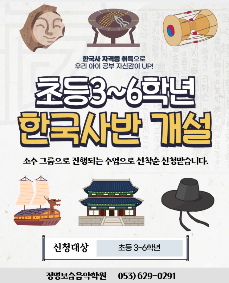 초등 한국사, 지금 시작해야 하는 이유 – 정명보습음악학원 한국사 안녕하세요. 정명보습음악학원입니다. 오늘은 "초등 3~6학년 학부모님들이 반드시 알아야 할 ‘한국사 교육의 필요성’"에 대해 이야기해보려고 합니다. 솔직히 말하면… 한국사는 중학교 가서 외우면 되지 않나? 이렇게 생각하시는 분들이 아직도 많아요. 하지만 현장에서 아이들을 지도하다 보면 “한국사는 늦게 시작할수록 고생한다” 이 말이 왜 맞는지 너무 뚜렷하게 보입니다. 1. 초등 시기에만 가능한 ‘배경지식 흡수력’이 있어요 초등 아이들의 뇌는 스토리 정보·이미지 정보를 가장 쉽게 흡수합니다. 한국사는 단순 암기가 아니라 “이야기 → 이해....... <img src="https://blogthumb.pstatic.net/MjAyNTEyMTFfMTY0/MDAxNzY1NDMwNjQyMzc4.qGiXLGUEnsZ-VfVAzXGl2PPwjGdVlfhUCNCTvOYRH9gg.gNl5NJN8B4wkHieVLH4U15--Z1yu2eUH4w4gxOFd9h8g.PNG/image.png?type=s3" />
