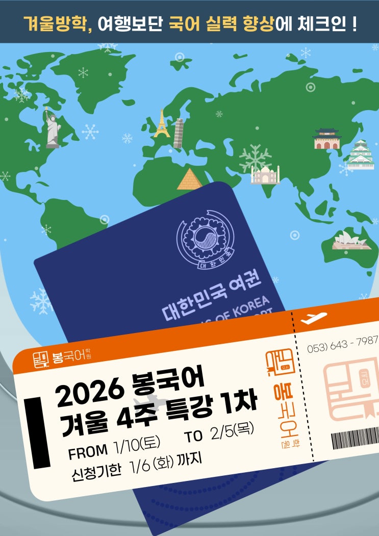 안녕하세요 봉국어학원입니다. 학년이 마무리됨에 따라 학생들의 국어 실력 향상을 위한 겨울 방학 특강을 진행합니다. 다음 학기 예습을 위한 다양한 특강이 진행되니 아래를 참고하여 학원으로 연락주시면 됩니다. 고등부 겨울 방학 특강 안내 기간 : 1월 10일(토)~ 2월 5일(목) 4주간 교습비 : 4주 10만원 각 특강의 여러 타임 중 가능한 시간 1타임을 선택하여 등원하면 됩니다. 1월 10일(토)부터 4주간 진행됩니다. 문법 특강 | 음운론 고1 내신에 포함되는 핵심 문법 단원! 내신 대비를 위한 필수 문법 특강입니다. 문법 특강 | 음운론 심화반 (고2 전용) 문법 특강 | 음운론 심화반 (고2 전용) 기본적인 음운 변동을 이해하고 있는 학생을....... <img src="https://blogthumb.pstatic.net/MjAyNTEyMjFfMjM3/MDAxNzY2Mjk4NDI2NzA4.VbGGGO-3O2SEc3AZL6-blucr90DpzLojDeYIRx5aymog.QzEtCEzGhQbAgZcVlV6DJUDrEouw418Y1rCnibU37Sgg.JPEG/KakaoTalk_20251221_144807309.jpg?type=s3" />