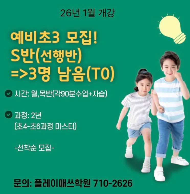 안녕하세요. 최상위권 학생들을 위한 월성동 수학학원 플레이매쓰학원 입니다. 현재 초3 S반(선행반) 입회가 현재 선착순으로 진행 중이며, 남은 자리는 단 3명입니다. S반은 단순히 진도를 빠르게만 나가는 반이 아닙니다. 초등 수학을 탄탄하게 완성하고, 중등·고등까지 이어지는 수능형 수학 로드맵을 목표로 설계된 집중 선행반입니다. S반의 핵심 구조 ✔️ 초3~초6 전 과정 선행 ✔️ 개념 이해 중심 수업으로 탄탄한 학습 ✔️ 중등 수학 빠른 입문 → 고등 수학 여유 확보 ✔️ 주 2회 90분 집중 수업 + 선택형 자습 운영 초등 선행의 가장 큰 차이는 **‘얼마나 빨리’가 아니라 ‘얼마나 완성도 있게’**입니다. S반은 개념–문제....... <img src="https://blogthumb.pstatic.net/MjAyNTEyMjZfMTcy/MDAxNzY2NzM2OTY4OTIz.iDhixSTGg4xbIkrRGDoeWIMdxn8CI7liFfyhsVw7nrwg.xk8x_Zybllt9wbeZx0KMh7qlWqZBrrYuj8UgDGv7AuIg.JPEG/KakaoTalk_20251226_165402095.jpg?type=s3" />