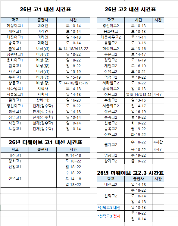 ★ 고등부 시간표 ★ 중3 시간표 ★ 중2 시간표 ★ 중1 시간표 <img src="https://blogthumb.pstatic.net/MjAyNjAyMjRfMTQ2/MDAxNzcxOTE3NDg2NTkx.f2_LWfvHgNb-ATKZWSPzxRAeTw_8sTExTZ7PykcAakkg.H_iHkWYtqOFIoSqXA-sFBQeZrvhSSf9OOWL14FO7DwQg.PNG/image.png?type=s3" />