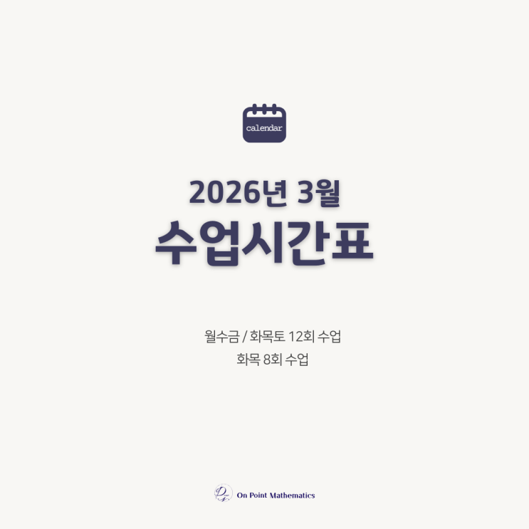 안녕하세요, 온포인트 수학학원입니다. 3월은 단순히 학년이 올라가는 시기가 아니라, 새로운 환경 속에서 생활 패턴과 학습 습관을 새롭게 자리잡아야 하는 ‘출발점’입니다. 설렘도 있지만 변화가 많은 시기인 만큼, 그 변화 속에서 아이들의 학습 리듬을 흔들리지 않도록 안정적인 학업 분위기를 형성하고 꾸준히 유지하며 지도하겠습니다. 초등부 초등부는 개별 학습 성취도에 맞는 진도로 수업을 진행하고 있어 학교 시험을 별도로 대비하지는 않습니다. 다만 개인 학습 상황에 따라 단원평가나 수행평가 시기에 맞춰 해당 단원을 복습&점검하는 수업을 진행하기도 합니다. 단원평가 준비가 필요한 경우, 시험 일정과 함께 담당 선생님....... <img src="https://blogthumb.pstatic.net/MjAyNjAyMjFfMTQg/MDAxNzcxNjM5OTU5MzY1.g9lJa1xpDC_B6SuWh0NDiRDWVjcQSbZe1AdBT8y2TwMg.E4Q6FHnhmmIuzKWI9SaMddBkzum-MinJFUpkcpoMj4gg.PNG/%BF%C2%C6%F7%C0%CE%C6%AE_%BC%F6%BE%F7%C0%CF%C1%A4_%BE%C8%B3%BB_2026%B3%E2_3%BF%F9.png?type=s3" />