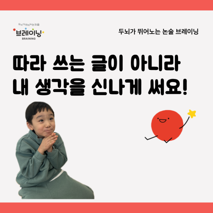이 나이에 이 정도면 괜찮은 건지 모르겠어요.. 글쓰기는 어느 정도 하는 건지.. 책을 읽고 제가 "어땠어? 무슨 내용이야?" 물어봐도 "좋아~ 몰라~" 로만 대답해요. "우리 아이 지금 괜찮은 걸까요?" 체험수업을 오시는 부모님들이 가장 많이 하시는 이야기입니다. 많은 부모님들이 “ 우리 아이가 뒤처지는 건 아닐까? ” 걱정하십니다. 그래서 더 많이 읽히고 더 많이 쓰게 합니다. 하지만 아이는 경험하지 않은 생각은 쉽게 쓸 수 없습니다. 지금 아이에게 필요한 것은 단순한 글쓰기 연습이 아니라 생각을 직접 경험하고 말해보고 마음껏 표현해 보는 '경험'이 필요합니다. 이런 성공 경험이 쌓이면....... <img src="https://blogthumb.pstatic.net/MjAyNjAzMThfMjI2/MDAxNzczODEzODY0OTc2.p0O1BwgwvNlgmSBbpiqTh2h6VUcO15yn9em9Yis8fasg.ZosHsCtUYo8OmEjTJ3GayapO77GJsooM9xjaafvYDdcg.PNG/%BA%ED%B7%CE%B1%D7_%BD%E6%B3%D7%C0%CF_%C6%F7%B8%E4.png?type=s3" />